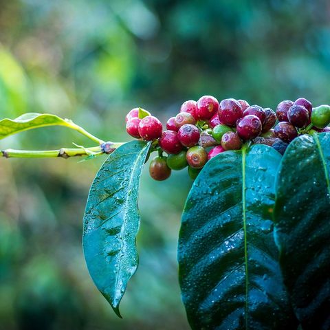 Kaffeebaum. Er wird bis zu 3m hoch, hat immergrüne, lederartige Blätter und trägt rote Früchte, sog. Kaffeekirschen. Seinen Ursprung hat der Kaffeebaum wahrscheinlich in Ostafrika, später wurde er dann in Süd- und Mittelamerika angepflanzt.